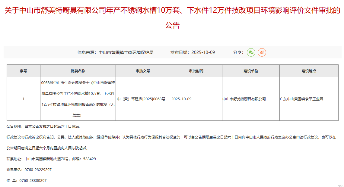2025年10月9日,中山市黃圃鎮(zhèn)生態(tài)環(huán)境保護(hù)局就中山市舒美特廚具有限公司年產(chǎn)不銹鋼水槽10萬套、下水件12萬件技改項(xiàng)目環(huán)境影響評價文件作出審批意見并對外進(jìn)行公告,公告期限:自本公告發(fā)布之日起滿六十日屆滿。
